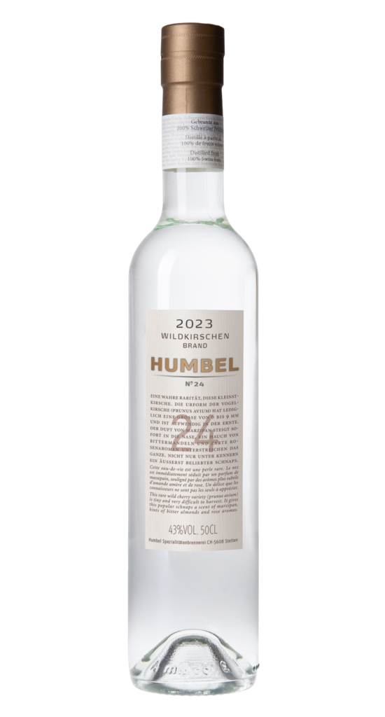 Die Urform der Vogelkirsche (Prunus Avium) hat lediglich eine Grösse von 6 bis 9mm und ist aufwendig in der Ernte. «Avium» stammt vom lateinischen «avis» für Vogel ab und verweist auf die Früchte, die gern von eben diesem gefressen werden. Der Begriff «Cerasus», mit dem die Römer den Kirschbaum bezeichneten, lebt in mehreren europäischen Sprachen weiter, etwa in «cerise» im Französichen oder «cherry» im Englischen, seit 1469 erstmals als «Kirsche» im Mittelhochdeutschen belegt und nicht zuletzt als «Chriesi» oder «Chirseni» im Schweizerdeutschen. Der Duft von Marzipan steigt sofort in die Nase, ein Hauch von Bittermandeln und Zarte Rosenaromen unterstreichen das Ganze. Nicht nur unter den Kennern ein äusserst beliebter Schnaps.