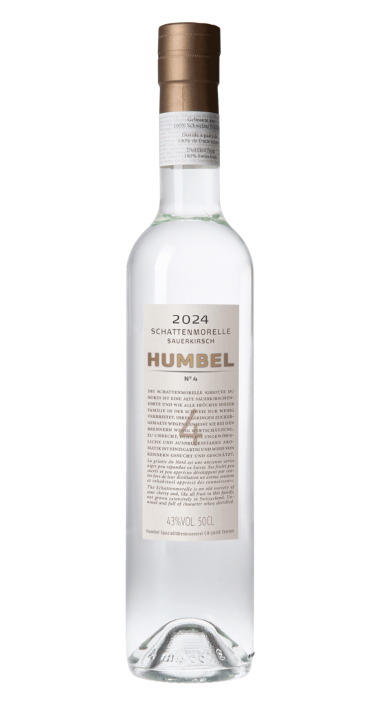 Die Schattenmorelle, eine braune Sauerkirsche, wird auch «Griotte du Nord» genannt. Charakteristisch ist ihr Stein mit rauer Oberfläche, der dem Destillat spürbar den typischen Steinton verleiht. Im Bouquet dominieren Zimt- und Marzipannoten.
