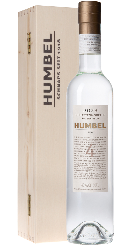 Die Schattenmorelle, eine braune Sauerkirsche, wird auch «Griotte du Nord» genannt. Charakteristisch ist ihr Stein mit rauer Oberfläche, der dem Destillat spürbar den typischen Steinton verleiht. Im Bouquet dominieren Zimt- und Marzipannoten.